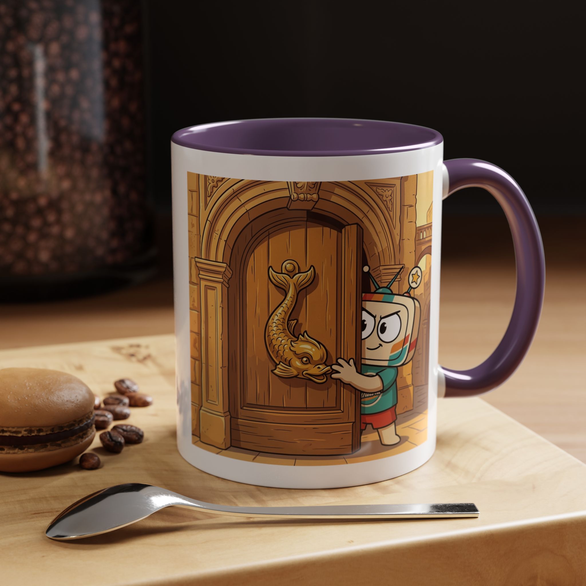 Vinty peering around a grand Mdina door at a giant brass knocker — the eternal Maltese childhood temptation on your morning coffee.