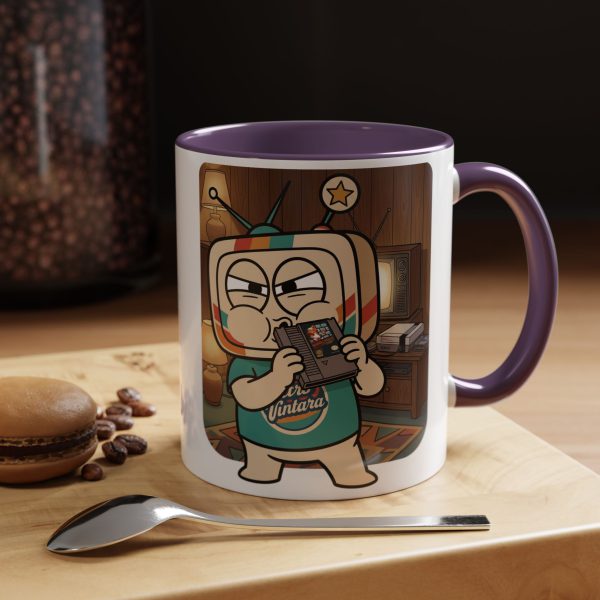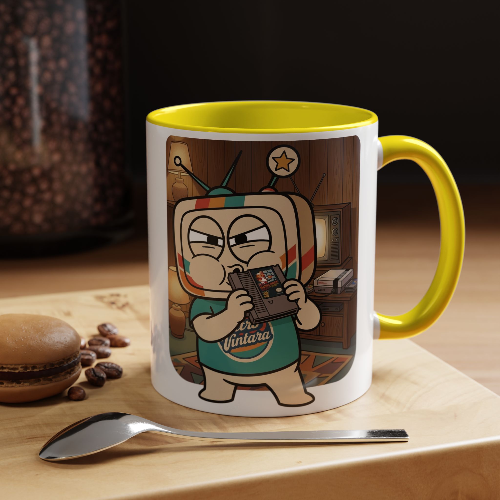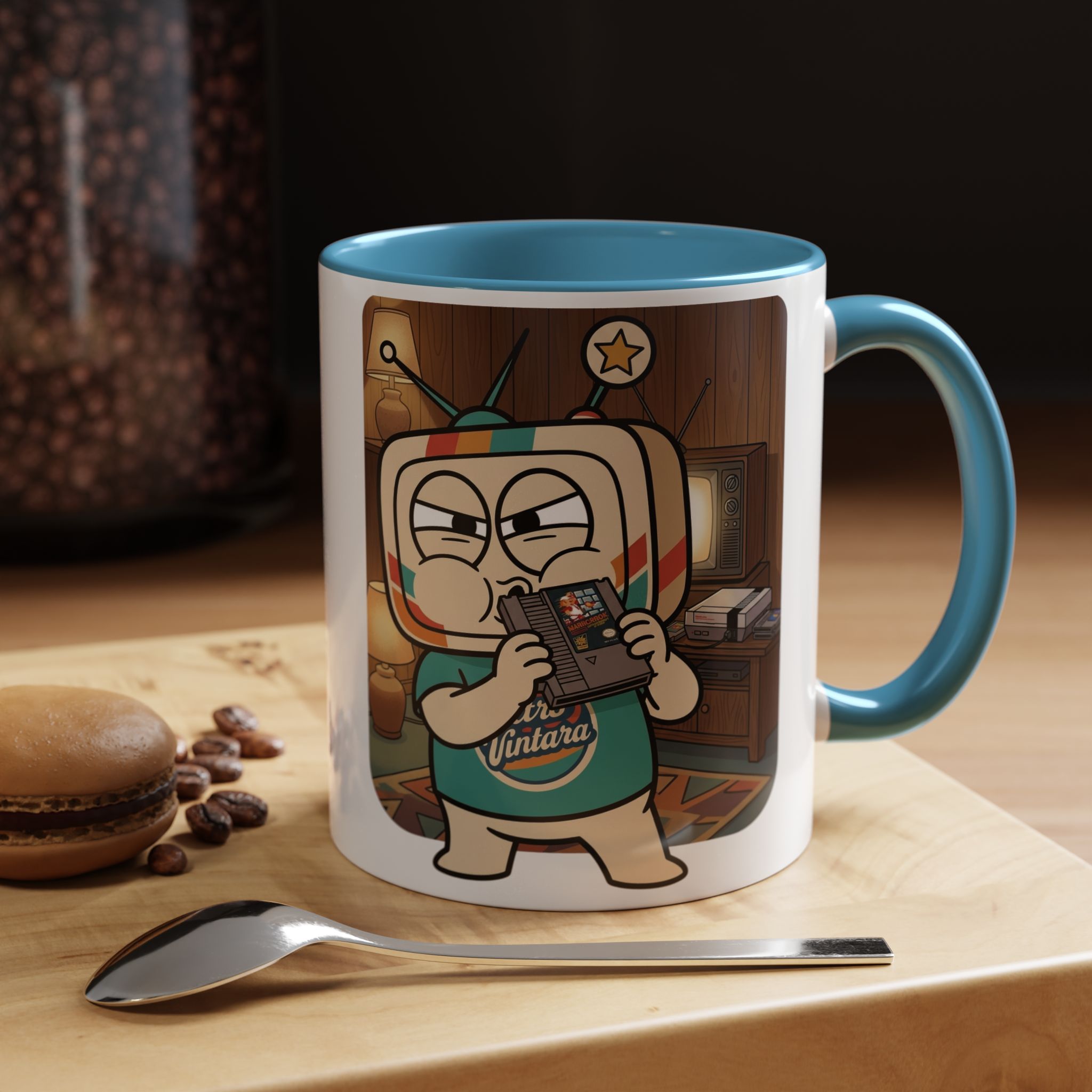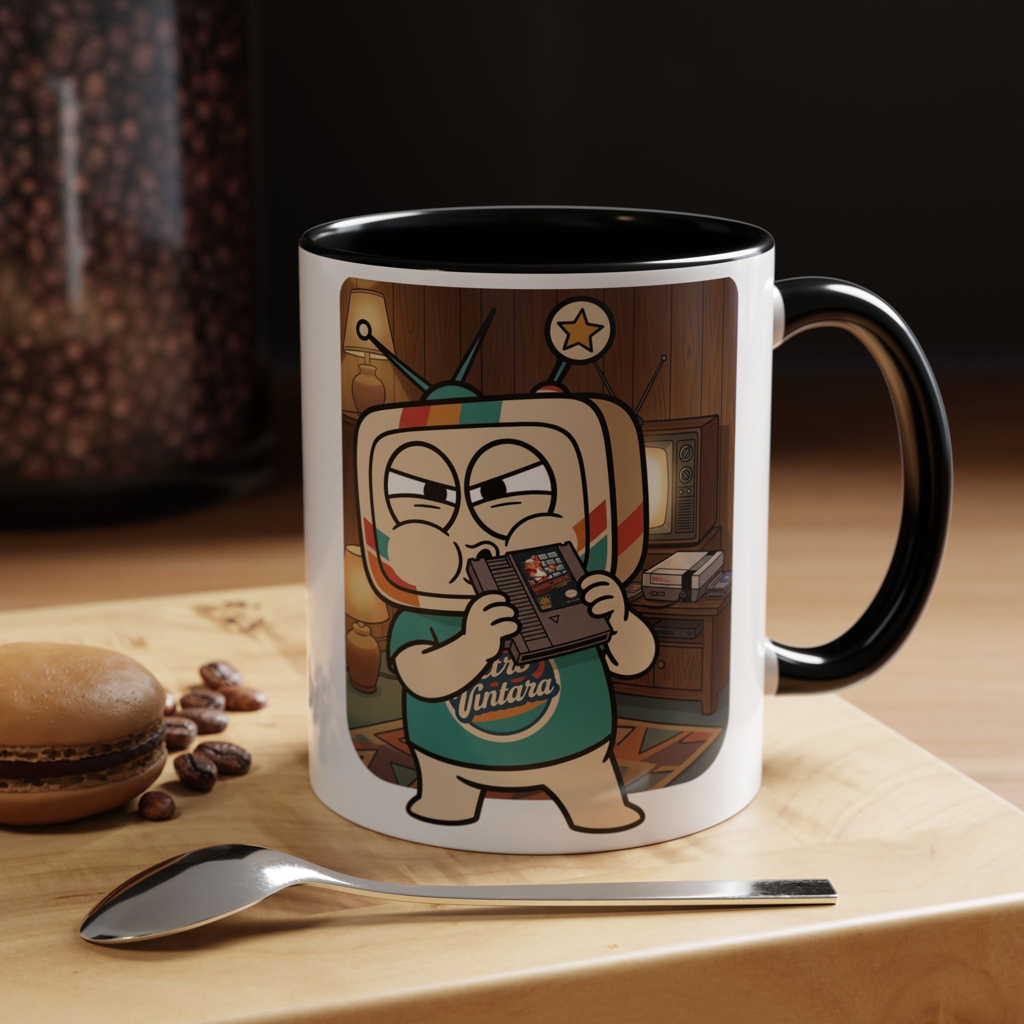 Vinty the Time Traveller grips that NES cartridge with maximum focus and zero doubts. This mug is for the ones who had a fix for everything — and it always involved blowing on something first.